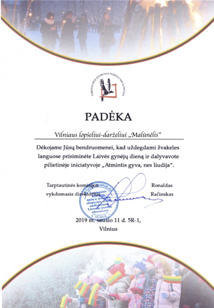 Padėkos raštas lopšelio-darželio bendruomenei už dalyvavimą pilietinėje iniciatyvoje „Atmintis gyva, nes liudija“, skirtoje paminėti sausio 13-ąją – Laisvės gynėjų dieną